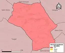 Le retrait-gonflement des sols argileux est susceptible d'engendrer des dommages importants aux bâtiments en cas d’alternance de périodes de sécheresse et de pluie. La totalité de la commune est en aléa moyen ou fort (94,5 % au niveau départemental et 48,5 % au niveau national). Sur les 84 bâtiments dénombrés sur la commune en 2019, 84 sont en aléa moyen ou fort, soit 100 %, à comparer aux 93 % au niveau départemental et 54 % au niveau national. Une cartographie de l'exposition du territoire national au retrait gonflement des sols argileux est disponible sur le site du BRGM[21],[Carte 3].