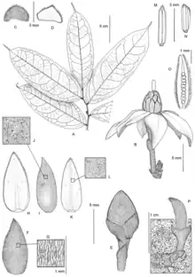 Les feuilles distiques, simples, sont entières. Le pétiole mesure 3 à 4 millimètres de long pour 2 à 3 millimètres de diamètre. Jeune, il est glabre ou faiblement pubescent. Il est légèrement rainuré sur le dessus. Le limbe, de forme ovale, mesure 20 à 26 centimètres de long et 4,5 à 9 centimètres de large. Il se termine par une pointe, nommée acumen, de 2 à 3 centimètres de long, alors que la base est obtuse. Il est coriace. Lorsqu'il est jeune, le dessus peut être faiblement pubescent ou glabre ; le dessous est toujours glabre. Les vieilles feuilles sont glabres des deux côtés. Il y a neuf à douze paires de nervures secondaires pennées[1].