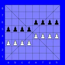 C'est ensuite au tour des noirs de déployer leurs pièces dans leur camp avec les mêmes contraintes, et l'interdiction de mettre de chariot dans la même colonne que le grand roi adverse, sauf s'il y a une pièce rouge autre qu'un soldat entre les deux[1].