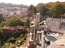 Le théâtre romain de Plovdiv est l'un des plus célèbres monuments de Bulgarie[4]. Il a été construit au début du IIe siècle, sous le règne de Trajan. Orienté au sud, il est adossé à un creux entre les deux collines de Djambaz Tepe et Taksim Tepe. Il forme un arc de cercle extérieur de 82 m.