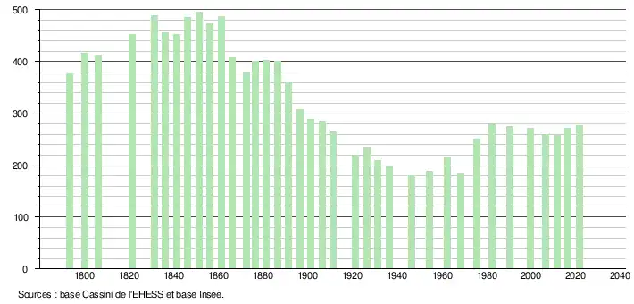 L'évolution du nombre d'habitants est connue à travers les recensements de la population effectués dans la commune depuis 1793. Pour les communes de moins de 10 000 habitants, une enquête de recensement portant sur toute la population est réalisée tous les cinq ans, les populations légales des années intermédiaires étant quant à elles estimées par interpolation ou extrapolation[14]. Pour la commune, le premier recensement exhaustif entrant dans le cadre du nouveau dispositif a été réalisé en 2006[15].