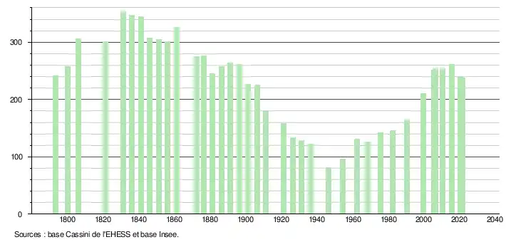 L'évolution du nombre d'habitants est connue à travers les recensements de la population effectués dans la commune depuis 1793. Pour les communes de moins de 10 000 habitants, une enquête de recensement portant sur toute la population est réalisée tous les cinq ans, les populations légales des années intermédiaires étant quant à elles estimées par interpolation ou extrapolation[16]. Pour la commune, le premier recensement exhaustif entrant dans le cadre du nouveau dispositif a été réalisé en 2005[17].