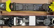 Vu de dessus, le ski alpin moderne possède ce qu'on appelle dans le jargon une taille de guêpe : la spatule et le talon sont plus larges que le patin. Cela se traduit par la définition d'une ligne de cotes, c’est-à-dire par la définition de la largeur du ski en ces trois points.