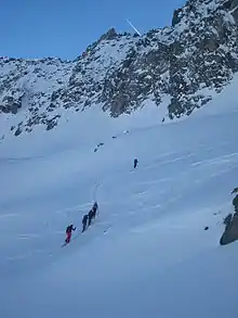 - le ski de randonnée, orienté vers l'activité de loisir, historique, contemplatif, sans objectif de performance ou de compétition[9]. Il consiste en une sortie à la journée ou de plusieurs jours (raids) avec un sac et un équipement adaptés. Les skis utilisés sont très proches dans leur conception des skis alpins dits « de piste » mais plus légers ; cette pratique n'exclut pas l'emploi de matériel d'alpinisme selon la difficulté ou les conditions. Il est désigné aussi sous l'appellation « ski de montagne », vulgarisée par Philippe Traynard[10] : « le ski de montagne est autonome, bien distinct des disciplines si voisines et si différentes de l'alpinisme et du ski de station[11]. Le ski de montagne est respectueux des paysages, par opposition au ski de piste qui les déforme et les artificialise »[12] ;