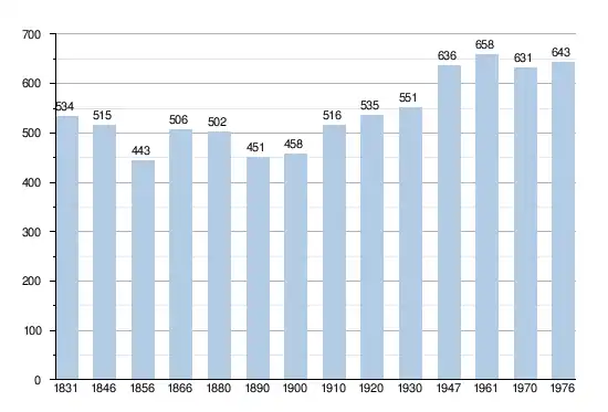 - Sources : INS, Rem. : 1831 jusqu'en 1970 = recensements, 1976 = nombre d'habitants au 31 décembre[2].