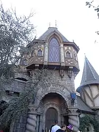 Les visiteurs entrent dans le bâtiment de l'attraction par le château de la méchante reine qui semble plutôt sombre et inquiétant. Au-dessus de l'entrée, se trouve une fenêtre en arc brisé avec une paire de rideaux. De temps à autre la reine tire les rideaux et lance son regard menaçant sur la foule.