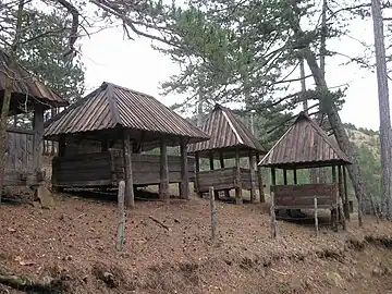Ce sont des bâtiments très simples construits sur une base rectangulaire, avec des fondations en pierres et un toit à quatre pans recouvert de bardeaux ou d'autres matériaux en fonction du climat. Le plus souvent, mais pas toujours, ces constructions sont dépourvues de murs et, alors, quatre piliers soutiennent le toit[réf. nécessaire].