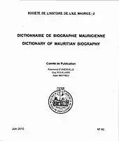 - Le Dictionnaire de Biographie Mauricienne (DBM), dont le premier numéro est paru en 1941 sous la direction d'Auguste Toussaint[3], avec une préface en français et en anglais d'Alfred de Simard de Pitray, président de la SHIM. Les biographies de 42 personnes y étaient évoquées. Par la suite les publications se succèderont régulièrement sous la direction du chercheur-archiviste Noël Regnard de 1952 à 1972 et de Raymond d’Unienville[n 2] depuis 1973. Un comité de rédaction participe aux éditions dont : Louis Hallais, Guy Rouillard[n 3], P.J. Barnwell[n 4], Alain Mathieu[n 5], Philippe La Hausse de La Louvière[n 6], et plus récemment Anne Goupille. Ainsi 65 publications ont été réalisées et plus de 2 400 vies de personnes liées à l'Ile Maurice ont pu être diffusées en français, mais aussi en anglais.