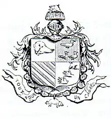 Écartelé : au 1 d'argent à une ombre de tête de cochon contournée ; au 2 de gueules à trois canards contournés d'argent mal ordonnés ; au 3 bandé de douze pièces de sinople et d'argent ; au 4 à une ombre d'un visage humain moqueur naissant de l'angle du canton senestre soutenu d'une ombre de deux mains faisant le pied de nez (le tout rangé en barre).