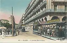 Un tramway tractant une baladeuse (voiture ouverte) dans l'avenue de Bab-el-Oued