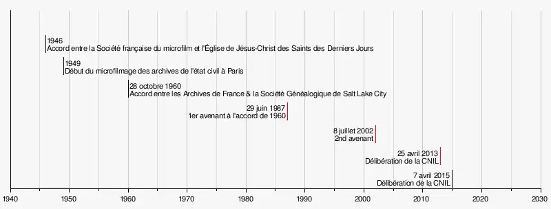 En 1946, un accord est conclu entre la Société française du microfilm et l'Église de Jésus-Christ des saints des derniers jours pour le microfilmage des registres d'état civil qui aboutit en 1949 au début du microfilmage des archives de l'état civil à Paris[2].