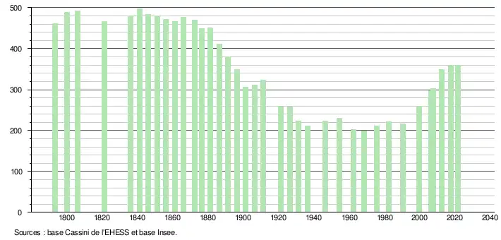 L'évolution du nombre d'habitants est connue à travers les recensements de la population effectués dans la commune depuis 1793. Pour les communes de moins de 10 000 habitants, une enquête de recensement portant sur toute la population est réalisée tous les cinq ans, les populations légales des années intermédiaires étant quant à elles estimées par interpolation ou extrapolation[13]. Pour la commune, le premier recensement exhaustif entrant dans le cadre du nouveau dispositif a été réalisé en 2007[14].