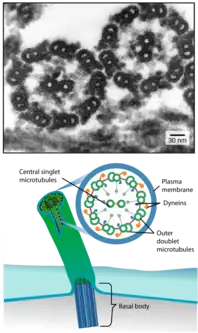 Le corps basal, composé de neuf triplets de microtubules, sert à ancrer les flagelles dans la cellule (agissant comme un centriole modifié). Au centre de chaque flagelle se trouve l'axonème, qui contient neuf doublets de microtubules encerclant une paire de microtubules simples, générant un motif 9+2[10],[11]. Des milliers de dynéines sont attachés aux doublets des axonèmes, permettant la motilité flagellaire[11]. Plus précisément, les dynéines s'ancrent sur un doublet à l'intérieur de l'anneau microtubulaire externe, et lorsqu'elles « marchent » vers un doublet adjacent, la structure flagellaire entière est capable de se plier et de battre[12]. Le mouvement du flagelle permet aux solénocytes de transporter les matériaux excréteurs et le liquide cœlomique dans la lumière du tubule intracellulaire[8].