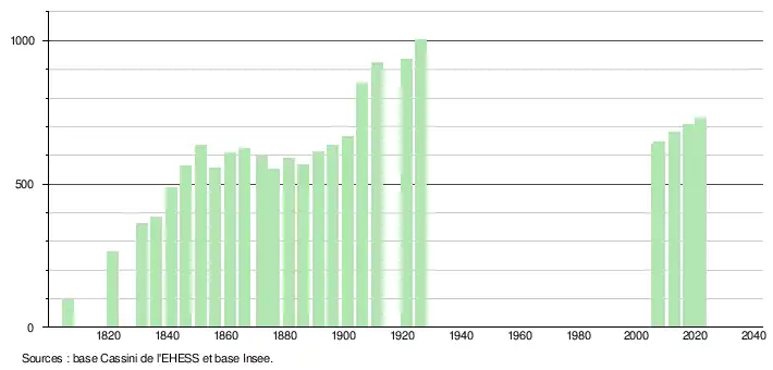 L'évolution du nombre d'habitants est connue à travers les recensements de la population effectués dans la commune depuis 1806. Pour les communes de moins de 10 000 habitants, une enquête de recensement portant sur toute la population est réalisée tous les cinq ans, les populations légales des années intermédiaires étant quant à elles estimées par interpolation ou extrapolation[12]. Pour la commune, le premier recensement exhaustif entrant dans le cadre du nouveau dispositif a été réalisé en 2007[13].