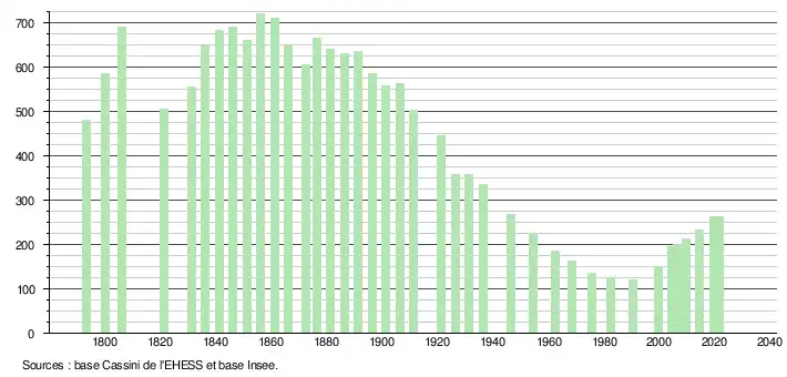 L'évolution du nombre d'habitants est connue à travers les recensements de la population effectués dans la commune depuis 1793. Pour les communes de moins de 10 000 habitants, une enquête de recensement portant sur toute la population est réalisée tous les cinq ans, les populations légales des années intermédiaires étant quant à elles estimées par interpolation ou extrapolation[20]. Pour la commune, le premier recensement exhaustif entrant dans le cadre du nouveau dispositif a été réalisé en 2004[21].