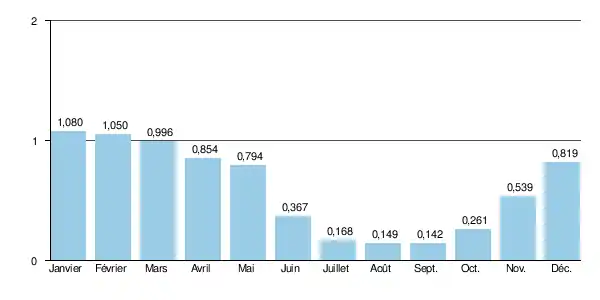 D'autre part les crues ne sont habituellement guère importantes. Les QIX 2 et QIX 5 valent respectivement 4,6 et 6,7 m3/s. Le QIX 10 vaut 8,1 m3/s, tandis que le QIX 20 se monte à 9,5 m3/s. Le QIX 50 n'a pas été calculé[2].