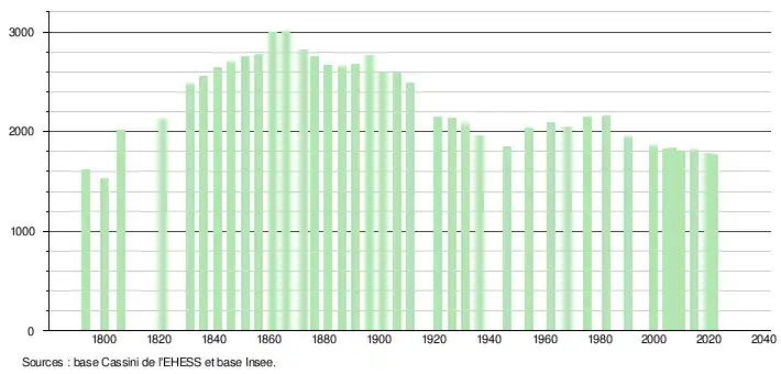L'évolution du nombre d'habitants est connue à travers les recensements de la population effectués dans la commune depuis 1793. Pour les communes de moins de 10 000 habitants, une enquête de recensement portant sur toute la population est réalisée tous les cinq ans, les populations légales des années intermédiaires étant quant à elles estimées par interpolation ou extrapolation[21]. Pour la commune, le premier recensement exhaustif entrant dans le cadre du nouveau dispositif a été réalisé en 2004[22].