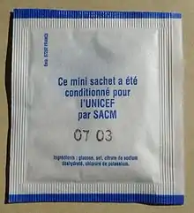 La composition actuellement (2017) recommandée par l'OMS (appelée « sels de réhydratation orale »[3], ou ORS en anglais) est de : 2,6 g de sel (NaCl), 2,9 g de citrate de sodium déshydraté (C6H5Na3O7⋅2H2O), 1,5 g de chlorure de potassium (KCl) et 13,5 g de glucose anhydre (C6H12O6) par litre d'eau[4].