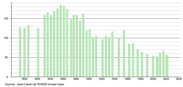 L'évolution du nombre d'habitants est connue à travers les recensements de la population effectués dans la commune depuis 1793. Pour les communes de moins de 10 000 habitants, une enquête de recensement portant sur toute la population est réalisée tous les cinq ans, les populations légales des années intermédiaires étant quant à elles estimées par interpolation ou extrapolation[16]. Pour la commune, le premier recensement exhaustif entrant dans le cadre du nouveau dispositif a été réalisé en 2005[17].