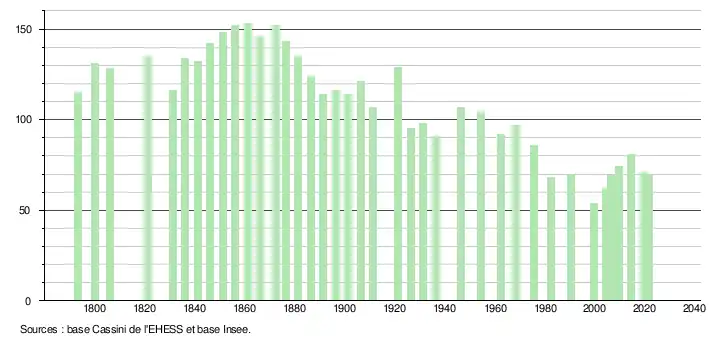 L'évolution du nombre d'habitants est connue à travers les recensements de la population effectués dans la commune depuis 1793. Pour les communes de moins de 10 000 habitants, une enquête de recensement portant sur toute la population est réalisée tous les cinq ans, les populations légales des années intermédiaires étant quant à elles estimées par interpolation ou extrapolation[20]. Pour la commune, le premier recensement exhaustif entrant dans le cadre du nouveau dispositif a été réalisé en 2004[21].