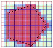 Ici, n–1 désigne le volume (n – 1)-dimensionnel. Définir une mesure (n – 1)-dimensionnelle devient subtil. Une première méthode consiste à généraliser la technique utilisée en dimension 1, pour un arc rectifiable. Elle demande d'être adaptée et est spécifique aux convexes. La mesure de la surface est alors la borne supérieure des convexes polyédriques inclus dans C1. La convexité est indispensable, sinon le contre-exemple de droite montre que la définition n'a pas de sens. La surface que l'on souhaite mesurer est un cylindre, le polyèdre utilisé est un lampion dont les sommets sont situés sur des hexagones chaque fois décalés d'un douzième de tour. Si les plans des hexagones se rapprochent de plus en plus, la surface du polyèdre augmente jusqu'à l'infini[2]. Une autre technique consiste à utiliser une forme différentielle et plus précisément une forme volume. La difficulté réside alors dans le fait que la surface d'un convexe n'a pas de raison d'être une variété de classe C1. Il devient nécessaire d'utiliser des espaces comparables à ceux de Sobolev pour définir la surface[3].
