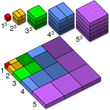 Plusieurs autres démonstrations sont possibles. L'une est fournie par Charles Wheatstone[7], qui développe chaque cube en une somme de nombres impairs consécutifs et utilise le fait que la somme des n premiers nombres impairs est égale à , et que la somme des n premiers entiers est égale au n-ième nombre triangulaire :