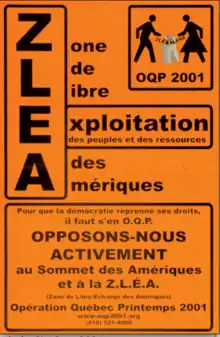 Afin d'éviter la montée des oppositions au projet de la ZLÉA, les chefs d'État et de gouvernement des Amériques confient à l'OÉA le mandat de mettre sur pied un groupe consultatif sur la participation de la société civile[11]. Ce contre-sommet est organisé par Common Frontiers et le Réseau québécois sur l'intégration continentale (RQJC), qui regroupent tous les principaux syndicats canadiens, le groupe de femmes, quelques associations étudiantes et d'autres ONG canadiennes militant en faveur d'un modèle alternatif à la ZLÉA[10]. Ces réseaux font partie de l'Alliance Sociale Continentale. Comme moyens de pression, elle favorise l'organisation d'événements parallèles d'envergure et de démonstrations massives, mais pacifiques[10]. Un travail important de sensibilisation aux effets de la mondialisation est organisé par ces organisations. Le RQJC, les syndicats indépendants (FIQ, FAQ et SFPQ), l'Opération SalAMI, Alternatives et la coalition de Québec OQP-2001 se côtoient[12]. Ensemble, ils forment la Table de convergence. Un travail important de sensibilisation aux effets de la mondialisation y est organisé. En mars 2001, l'opération SalAMI organise une perquisition citoyenne au ministère des Affaires Étrangères à Ottawa afin de libérer les textes de la ZLÉA qui sont tenus cachés du public[12].