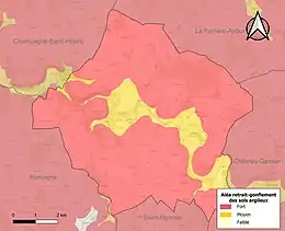 Les mouvements de terrains susceptibles de se produire sur la commune sont des affaissements et effondrements liés aux cavités souterraines (hors mines) et des tassements différentiels[19]. Afin de mieux appréhender le risque d’affaissement de terrain, un inventaire national permet de localiser les éventuelles cavités souterraines sur la commune[20]. Le retrait-gonflement des sols argileux est susceptible d'engendrer des dommages importants aux bâtiments en cas d’alternance de périodes de sécheresse et de pluie[21]. 99,9 % de la superficie communale est en aléa moyen ou fort (79,5 % au niveau départemental et 48,5 % au niveau national)[Carte 2]. Depuis le , en application de la loi ÉLAN, différentes contraintes s'imposent aux vendeurs, maîtres d'ouvrages ou constructeurs de biens situés dans une zone classée en aléa moyen ou fort[Note 2],[22].