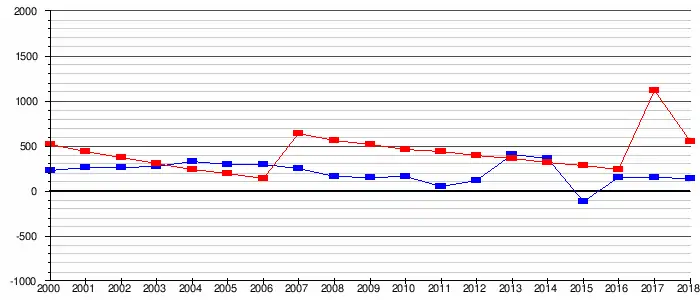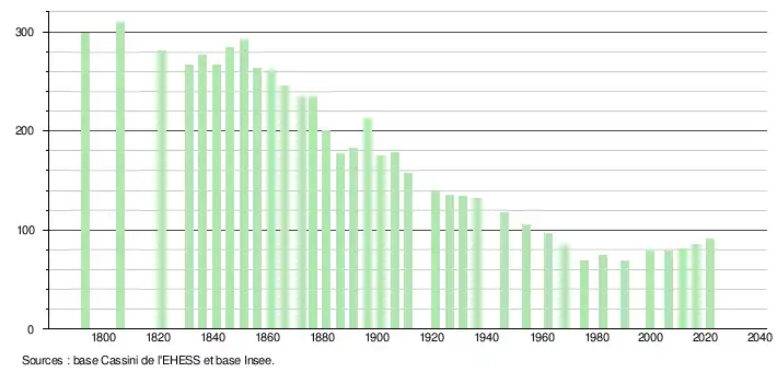 L'évolution du nombre d'habitants est connue à travers les recensements de la population effectués dans la commune depuis 1793. Pour les communes de moins de 10 000 habitants, une enquête de recensement portant sur toute la population est réalisée tous les cinq ans, les populations légales des années intermédiaires étant quant à elles estimées par interpolation ou extrapolation[35]. Pour la commune, le premier recensement exhaustif entrant dans le cadre du nouveau dispositif a été réalisé en 2006[36].