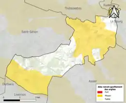Le retrait-gonflement des sols argileux est susceptible d'engendrer des dommages importants aux bâtiments en cas d’alternance de périodes de sécheresse et de pluie. 59,4 % de la superficie communale est en aléa moyen ou fort (67,7 % au niveau départemental et 48,5 % au niveau national). Sur les 76 bâtiments dénombrés sur la commune en 2019, 46 sont en aléa moyen ou fort, soit 61 %, à comparer aux 72 % au niveau départemental et 54 % au niveau national. Une cartographie de l'exposition du territoire national au retrait gonflement des sols argileux est disponible sur le site du BRGM[24],[Carte 2].