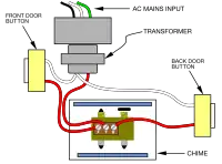 Dans la plupart des systèmes filaires, un bouton situé à l'extérieur à côté de la porte, à peu près à la hauteur de la poignée de porte, active un dispositif de signalisation (généralement un carillon, une cloche ou une bipeur) à l'intérieur du bâtiment. En appuyant sur le bouton de la sonnette, un interrupteur à bouton-poussoir unipolaire et unidirectionnel (SPST) ferme momentanément le circuit de la sonnette. Une borne de ce bouton est reliée à une borne d'un transformateur. Le transformateur de sonnette abaisse le courant électrique de 120 ou 240 volts à une tension inférieure, généralement de 10 à 24 volts. L'autre borne du transformateur est reliée à l'une des trois bornes du dispositif de signalisation. Une autre borne est reliée à un fil qui se rend à l'autre borne du bouton. Certains dispositifs de signalisation ont une troisième borne, qui produit un son différent. S'il y a un autre bouton de sonnette (généralement près d'une porte arrière), il est connecté entre le transformateur et la troisième borne. L'enroulement primaire du transformateur, étant alimenté en permanence, consomme une petite quantité (environ 1 à 2 watt) d'énergie en veille en permanence ; les systèmes avec des interrupteurs à bouton-poussoir lumineux peuvent consommer une quantité d'énergie similaire par interrupteur[4],[5]. La contrepartie est que le câblage vers le bouton ne transporte qu'une basse tension sûre, isolée de la terre.