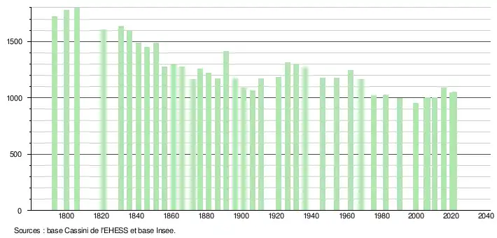 L'évolution du nombre d'habitants est connue à travers les recensements de la population effectués dans la commune depuis 1793. Pour les communes de moins de 10 000 habitants, une enquête de recensement portant sur toute la population est réalisée tous les cinq ans, les populations légales des années intermédiaires étant quant à elles estimées par interpolation ou extrapolation[20]. Pour la commune, le premier recensement exhaustif entrant dans le cadre du nouveau dispositif a été réalisé en 2005[21].