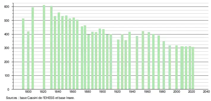 L'évolution du nombre d'habitants est connue à travers les recensements de la population effectués dans la commune depuis 1793. Pour les communes de moins de 10 000 habitants, une enquête de recensement portant sur toute la population est réalisée tous les cinq ans, les populations légales des années intermédiaires étant quant à elles estimées par interpolation ou extrapolation[33]. Pour la commune, le premier recensement exhaustif entrant dans le cadre du nouveau dispositif a été réalisé en 2007[34].