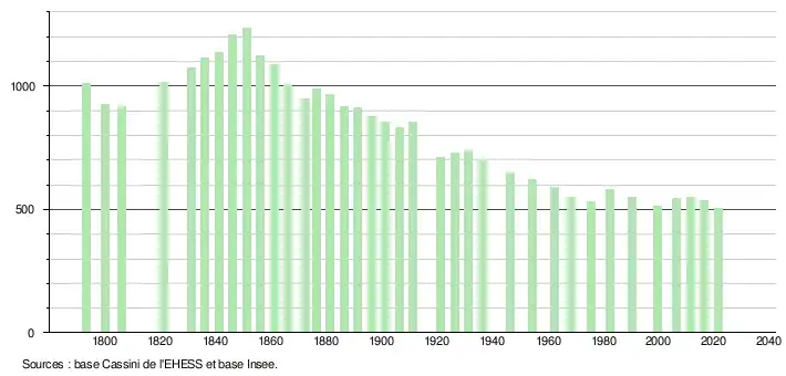 L'évolution du nombre d'habitants est connue à travers les recensements de la population effectués dans la commune depuis 1793. Pour les communes de moins de 10 000 habitants, une enquête de recensement portant sur toute la population est réalisée tous les cinq ans, les populations légales des années intermédiaires étant quant à elles estimées par interpolation ou extrapolation[21]. Pour la commune, le premier recensement exhaustif entrant dans le cadre du nouveau dispositif a été réalisé en 2006[22].