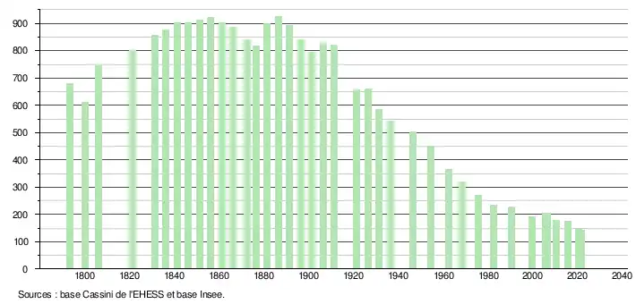 L'évolution du nombre d'habitants est connue à travers les recensements de la population effectués dans la commune depuis 1793. Pour les communes de moins de 10 000 habitants, une enquête de recensement portant sur toute la population est réalisée tous les cinq ans, les populations légales des années intermédiaires étant quant à elles estimées par interpolation ou extrapolation[28]. Pour la commune, le premier recensement exhaustif entrant dans le cadre du nouveau dispositif a été réalisé en 2005[29].