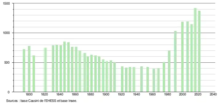 L'évolution du nombre d'habitants est connue à travers les recensements de la population effectués dans la commune depuis 1793. Pour les communes de moins de 10 000 habitants, une enquête de recensement portant sur toute la population est réalisée tous les cinq ans, les populations légales des années intermédiaires étant quant à elles estimées par interpolation ou extrapolation[27]. Pour la commune, le premier recensement exhaustif entrant dans le cadre du nouveau dispositif a été réalisé en 2006[28].