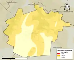 Le retrait-gonflement des sols argileux est susceptible d'engendrer des dommages importants aux bâtiments en cas d’alternance de périodes de sécheresse et de pluie. 68,5 % de la superficie communale est en aléa moyen ou fort (52,8 % au niveau départemental et 48,5 % au niveau national). Sur les 194 bâtiments dénombrés sur la commune en 2019, 115 sont en aléa moyen ou fort, soit 59 %, à comparer aux 70 % au niveau départemental et 54 % au niveau national. Une cartographie de l'exposition du territoire national au retrait gonflement des sols argileux est disponible sur le site du BRGM[18],[Carte 2].