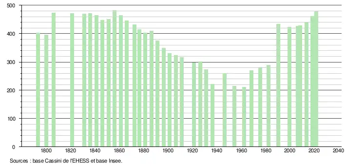 L'évolution du nombre d'habitants est connue à travers les recensements de la population effectués dans la commune depuis 1793. Pour les communes de moins de 10 000 habitants, une enquête de recensement portant sur toute la population est réalisée tous les cinq ans, les populations légales des années intermédiaires étant quant à elles estimées par interpolation ou extrapolation[23]. Pour la commune, le premier recensement exhaustif entrant dans le cadre du nouveau dispositif a été réalisé en 2008[24].