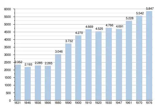 Les chiffres des années 1831 à 1970 tiennent compte des chiffres des anciennes communes fusionnées.