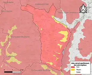 Le retrait-gonflement des sols argileux est susceptible d'engendrer des dommages importants aux bâtiments en cas d’alternance de périodes de sécheresse et de pluie[19]. La totalité de la commune est en aléa moyen ou fort (91,8 % au niveau départemental et 48,5 % au niveau national)[Carte 2]. Depuis le , en application de la loi ELAN, différentes contraintes s'imposent aux vendeurs, maîtres d'ouvrages ou constructeurs de biens situés dans une zone classée en aléa moyen ou fort[Note 3],[20].