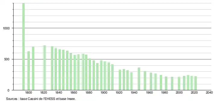 L'évolution du nombre d'habitants est connue à travers les recensements de la population effectués dans la commune depuis 1793. Pour les communes de moins de 10 000 habitants, une enquête de recensement portant sur toute la population est réalisée tous les cinq ans, les populations légales des années intermédiaires étant quant à elles estimées par interpolation ou extrapolation[27]. Pour la commune, le premier recensement exhaustif entrant dans le cadre du nouveau dispositif a été réalisé en 2006[28].