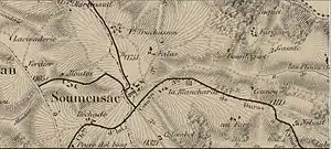 Il faut s'imaginer que jusqu'au XVIIIe siècle, Soumensac n'était qu'une forteresse sans maisons d'habitation ni église paroissiale ; la chapelle du château, petite, servait de lieu de culte. Elle était située à l'emplacement de l'église actuelle mais 2,40 mètres plus bas ! Son portail se situait approximativement vers le chœur actuel au niveau d'une niche que l'on peut voir dans le mur de gauche de la nef (source orale Mariens Borcy qui a effectué des fouilles au moment de la restauration de l'église dans les années 60). Le cimetière était à l'ouest dans ce qu'on appelle aujourd'hui le "jardin du presbytère". La plupart du temps, le seigneur n'habitait pas sur place mais au château de Gorce dont seuls les souterrains subsistent encore. Une allée de chênes, visible sur la carte de Belleyme, permettait de faire le trajet à travers la forêt. Georges Combaud, ancien maire du village, disait les avoir connus au début du XXe siècle. S'il n'y avait pas de bourg à Soumensac même, nombreux étaient les villages : Gassac, Fougueyrat, Béchade, etc. (voir la carte de Belleyme ci-dessous. À la suite de la révocation de l'Édit de Nantes sous Louis XIV plusieurs de ces villages ont disparu, vidés de ses habitants. Comme à chaque fois qu'une population est expulsée d'un pays, les arabes ou les juifs en Espagne, les huguenots en France..., le pays connaît alors une crise économique liée au manque de bras et de cerveaux.