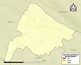 Le retrait-gonflement des sols argileux est susceptible d'engendrer des dommages importants aux bâtiments en cas d’alternance de périodes de sécheresse et de pluie[33]. Aucune partie du territoire de la commune n'est en aléa moyen ou fort (59 % au niveau départemental et 48,5 % au niveau national)[Carte 4]. Depuis le , en application de la loi ELAN, différentes contraintes s'imposent aux vendeurs, maîtres d'ouvrages ou constructeurs de biens situés dans une zone classée en aléa moyen ou fort[Note 7],[34].