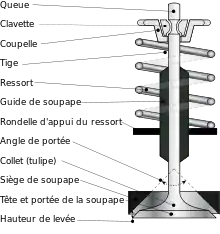 - partie terminale de la soupape, supporte l'action du poussoir actionné par l'arbre à cames. Elle comporte une ou plusieurs gorges, le plus souvent de section semi-circulaire, pour loger les clavettes qui transmettent à la soupape la tension du ressort de rappel[6].
