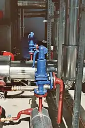 On installe une soupape de sûreté[2] (appelée sécurité usuellement ou soupape de décharge pour les liquides industrielles et les véhicules à turbocompresseur) sur les réservoirs/tuyauteries de gaz/liquide pouvant être soumis à des variations de pression, ainsi que sur des chaudières à vapeur.