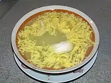 Яичный суп (Yaichnyy sup) classique soupe aux œufs battus ne contient ni viande ni poisson, mais uniquement œufs et légumes[24]. Elle contient souvent du vermicelle[25]. Il existe des versions luxueuses, comme la soupe aux œufs de saumon (caviar rouge)[26].