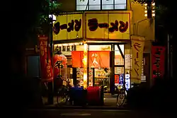 - Rāmen ラーメン) – nouilles minces et jaunes servies dans un bouillon chaud au poulet ou au porc, aromatisées par le soja ou le miso, avec diverses garnitures telles que des tranches de porch, menma (pousses de bamboo au vinaigre), algues, ou œufs cuits. Aussi connu sous le nom de Shina-soba ou Chuka-soba (signifiant "soba chinoise").
