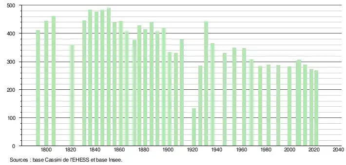 L'évolution du nombre d'habitants est connue à travers les recensements de la population effectués dans la commune depuis 1793. Pour les communes de moins de 10 000 habitants, une enquête de recensement portant sur toute la population est réalisée tous les cinq ans, les populations légales des années intermédiaires étant quant à elles estimées par interpolation ou extrapolation[24]. Pour la commune, le premier recensement exhaustif entrant dans le cadre du nouveau dispositif a été réalisé en 2007[25].