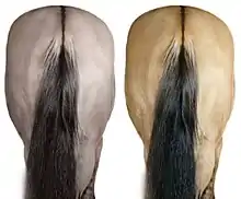Le cheval présente des marques primitives caractéristiques[21], de couleur noire[2], qui sont associées à toutes les robes de chevaux issues d'une dilution par le gène Dun[22]. Ces marques primitives incluent une raie de mulet systématique[23] ; de très fréquentes[18] zébrures sur les membres (généralement au niveau du genou et du jarret (en))[19] ; plus rarement un cap de Maure, c'est-à-dire une couleur plus sombre, voire noire, au niveau de la tête[15]. D'autres marques sont possibles, bien que rares : bande scapulaire[23], marque noire au-dessus des yeux, et cobwebbing, le marquage le plus rare, en forme de toile d'araignée, situé sur la tête du cheval[18].