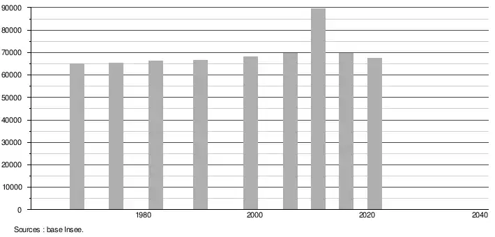 - Population municipale légale en vigueur au 1er janvier 2024, millésimée 2021, définie dans les limites territoriales en vigueur au 1er janvier 2023, date de référence statistique : 1er janvier 2021.